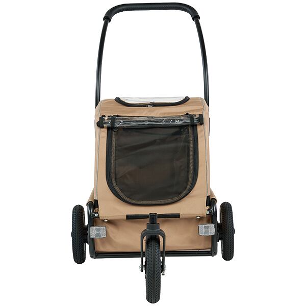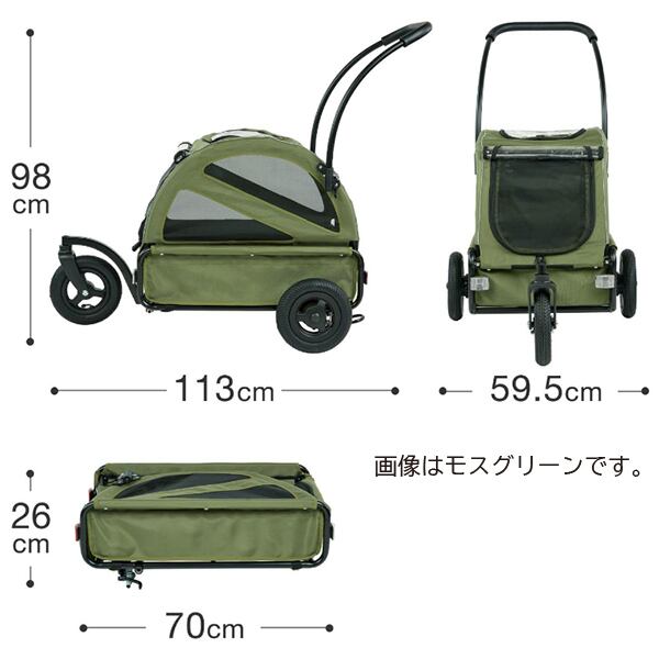 中型犬や小型犬の多頭飼いに人気の中型モデル。車輪を外せば、ハウスとしてご使用できます。愛犬が自ら乗り降りできる設計で抱きあげる必要がありません。折りたたむと厚さ26cmのコンパクトに。フロント・リア両サイドにリフレクターを搭載し、夜道も安心。