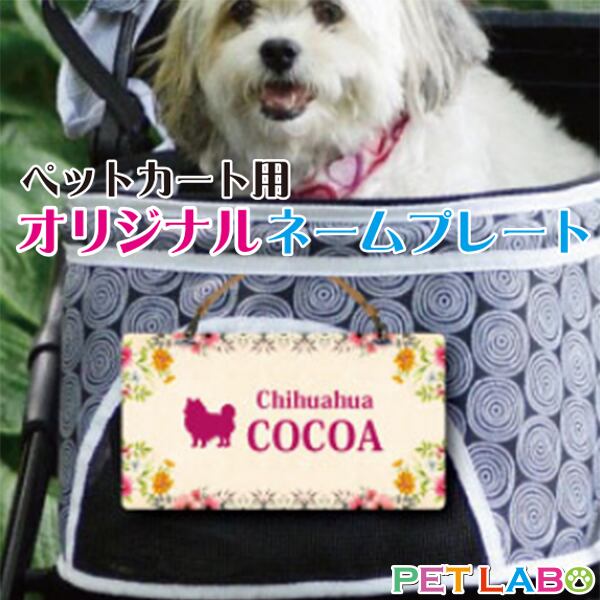 ペットカート・ペットバギーに取り付けることができる、軽くて丈夫な樹脂製プレートに耐水性UVプリントをしたカート用ネームプレートです。