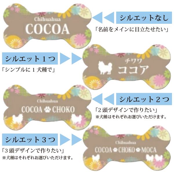 プレートデザインは34種類からお選びいただけ、犬用シルエットは200種類以上、猫用シルエットは60種類以上をご用意しました。さらに、QRコードを入れることも可能。愛するわが子のお名前や特別なメッセージを入れることで、世界にひとつだけのプレートが完成します!!