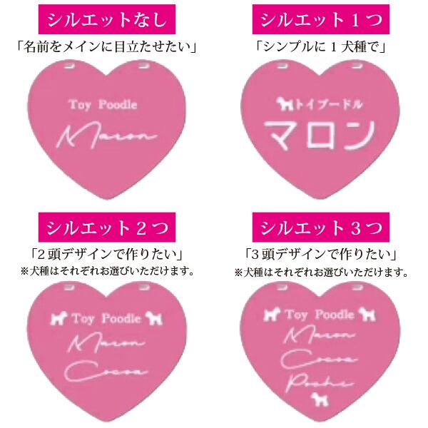 プレートデザインは34種類からお選びいただけ、犬用シルエットは200種類以上、猫用シルエットは60種類以上をご用意しました。さらに、QRコードを入れることも可能。愛するわが子のお名前や特別なメッセージを入れることで、世界にひとつだけのプレートが完成します!!