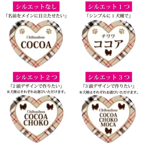 プレートデザインは34種類からお選びいただけ、犬用シルエットは200種類以上、猫用シルエットは60種類以上をご用意しました。さらに、QRコードを入れることも可能。愛するわが子のお名前や特別なメッセージを入れることで、世界にひとつだけのプレートが完成します!!