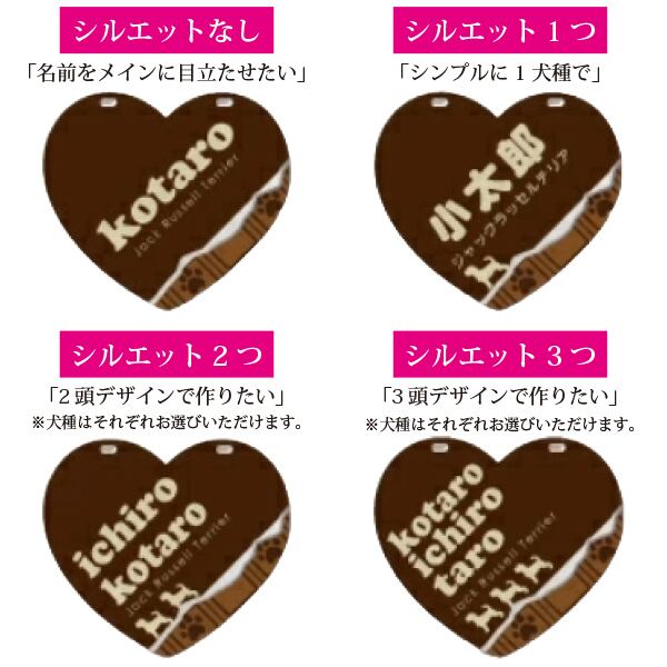 プレートデザインは34種類からお選びいただけ、犬用シルエットは200種類以上、猫用シルエットは60種類以上をご用意しました。さらに、QRコードを入れることも可能。愛するわが子のお名前や特別なメッセージを入れることで、世界にひとつだけのプレートが完成します!!