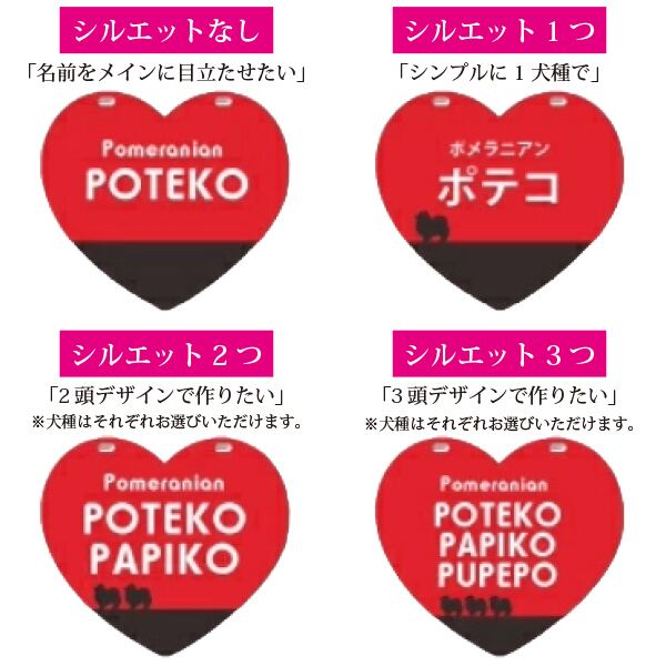 プレートデザインは34種類からお選びいただけ、犬用シルエットは200種類以上、猫用シルエットは60種類以上をご用意しました。さらに、QRコードを入れることも可能。愛するわが子のお名前や特別なメッセージを入れることで、世界にひとつだけのプレートが完成します!!