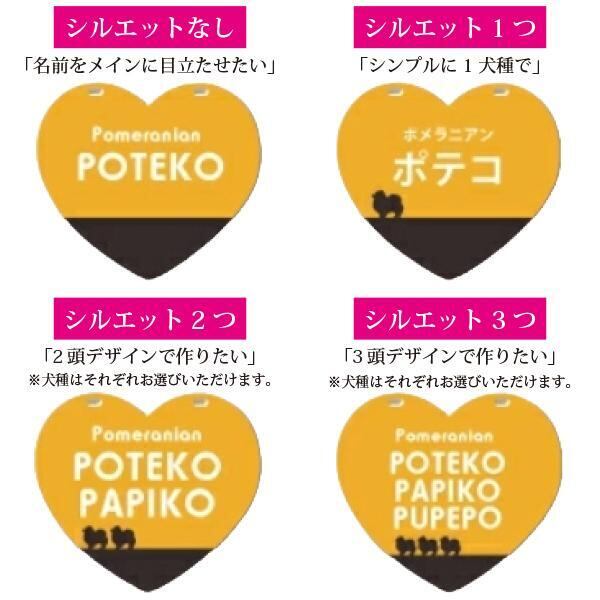 プレートデザインは34種類からお選びいただけ、犬用シルエットは200種類以上、猫用シルエットは60種類以上をご用意しました。さらに、QRコードを入れることも可能。愛するわが子のお名前や特別なメッセージを入れることで、世界にひとつだけのプレートが完成します!!
