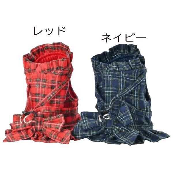 レッドとネイビーの上品なチェック柄にリボンとフリルで可愛らしく、お洋服の様に着こなして頂ける犬用ハーネスです。