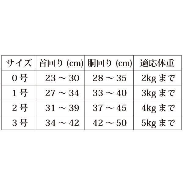 0号:首回り23〜30cm、胴回り28〜35cm、適応体重2kgまで