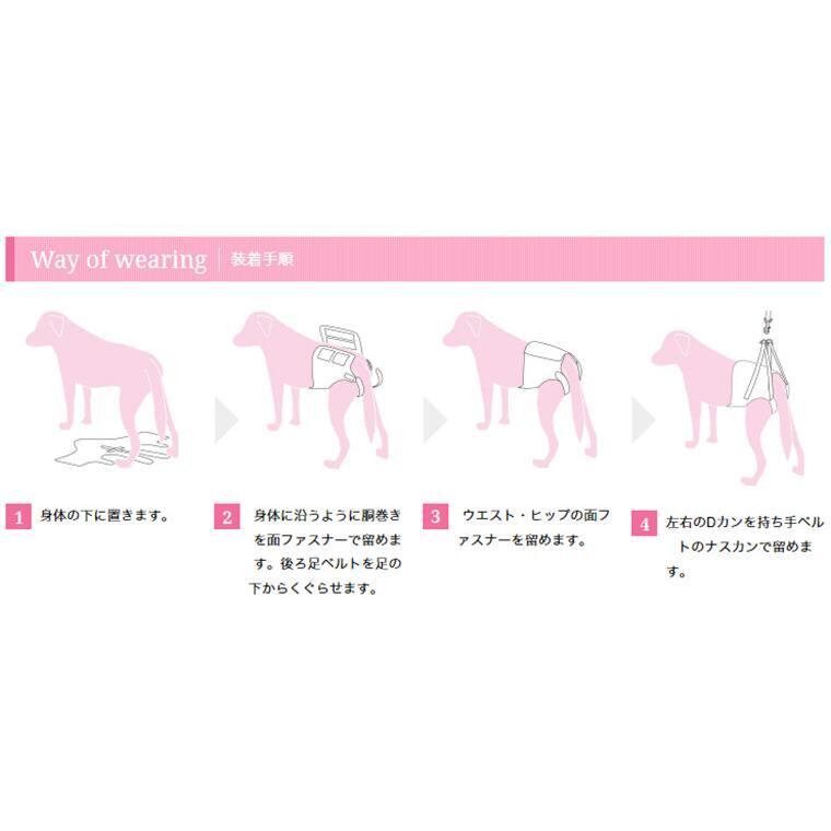 LaLaWalk Hip(ララウォークヒップ)は、腰が悪くなったり、脚力が低下したワンちゃんの起き上がりを助け、歩行を補助するハーネスで、ワンちゃんの左右の後肢を付け根から均等にバランス良く吊り上げます。