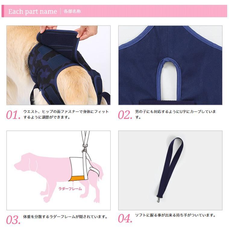 LaLaWalk Hip(ララウォークヒップ)は、腰が悪くなったり、脚力が低下したワンちゃんの起き上がりを助け、歩行を補助するハーネスで、ワンちゃんの左右の後肢を付け根から均等にバランス良く吊り上げます。