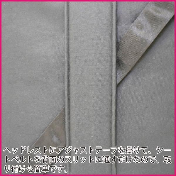 ヘッドレストにアジャストテープを掛けて、シートベルトを背面のスリットに通すだけで簡単に取り付けができます。