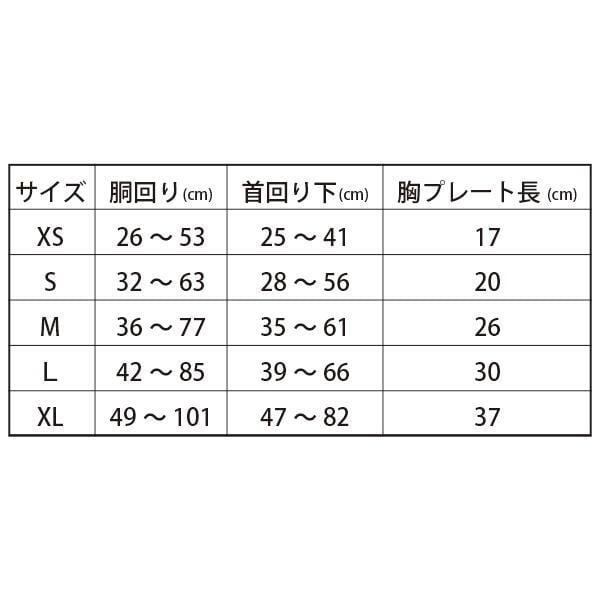 XSサイズ:胴回り26cm〜53cm、首まわり下25cm〜41cm、胸プレート長さ17cm、重量98g