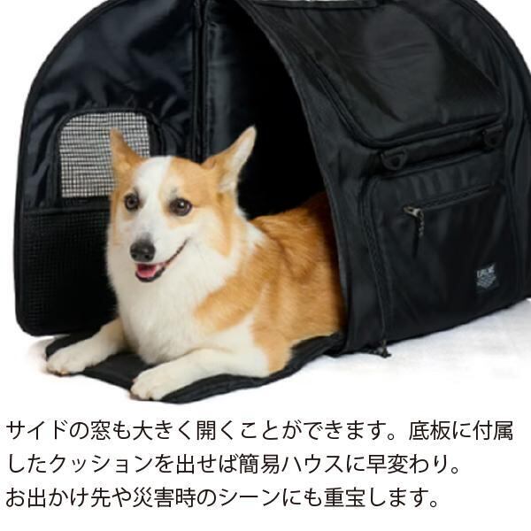 サイドのメッシュ窓を開き、底板に付属したクッションを出して使うことができます。顎のせが大好きなワンちゃんにピッタリ♪