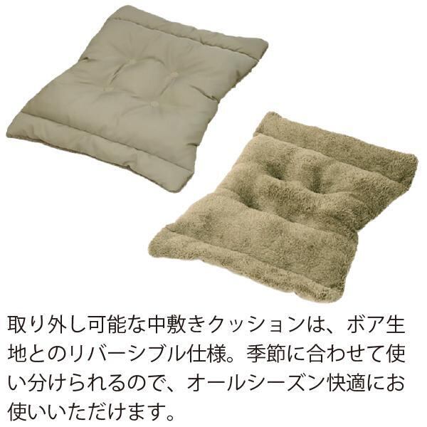 就寝時は安心のハウスに、日中は開放的なベッドにと、用途に応じて使い分けることができます。取り外し可能な中敷クッションは、ボア生地とのリバーシブル仕様。季節に合わせて使い分けられるので、オールシーズン快適にお使いいただけます。
