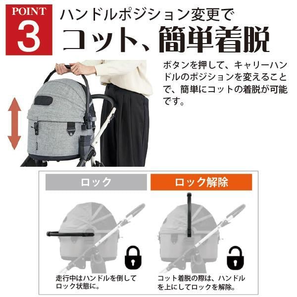 また、キャリーハンドルのポジション変更でコットも簡単に着脱が可能です。