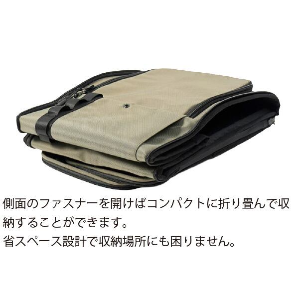 側面のファスナーを開けば、コンパクトに折りたたんで収納することができます。