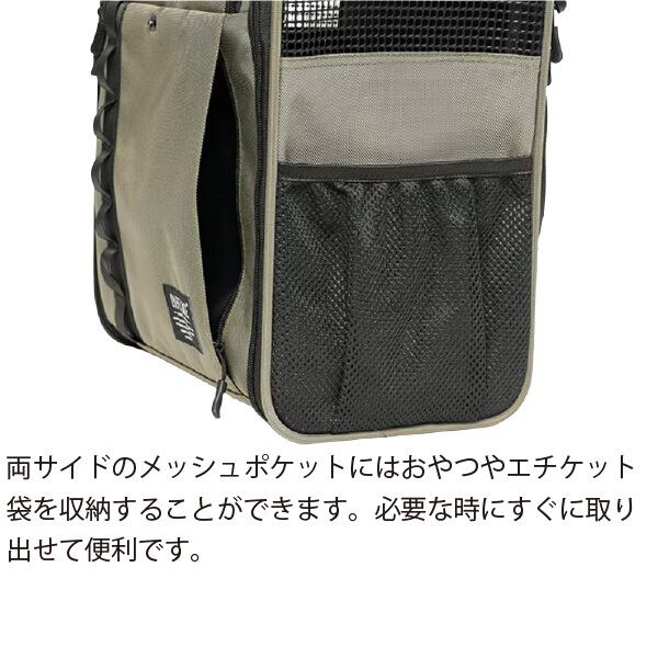 両サイドのメッシュポケットには、おやつやエチケット袋を収納することができます。必要な時にすぐ取り出せて便利!