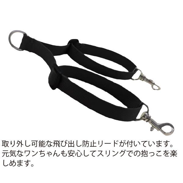 取り外し可能な飛び出し防止リードがついているので、元気なワンちゃんも安心してスリングでの抱っこを楽しめます。