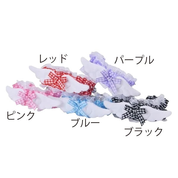 ふわふわの天使の羽に、ギンガムチェックのリボンを添えたシュシュ型首輪です。