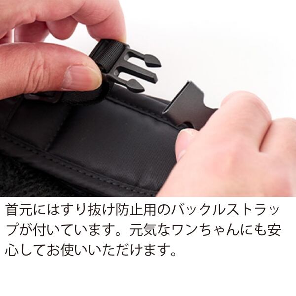 首元にはすり抜け防止用のバックルストラップ付き。元気なワンちゃんにも安心してお使いいただけます。