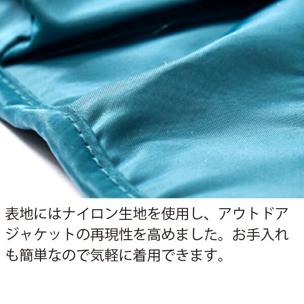 表地にはお手入れも簡単なナイロン生地を使用し、マウンテンパーカーの再現性を高めました。