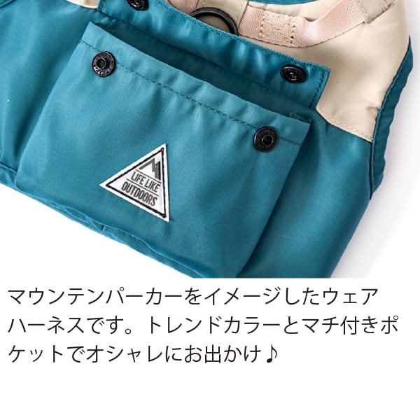 マウンテンパーカーをイメージしたウェアハーネスです。トレンドカラーとマチ付きポケットでオシャレにお出かけ♪
