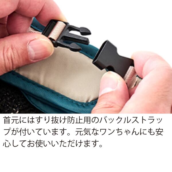 首元にはすり抜け防止用のバックルストラップ付き。元気なワンちゃんにも安心してお使いいただけます。