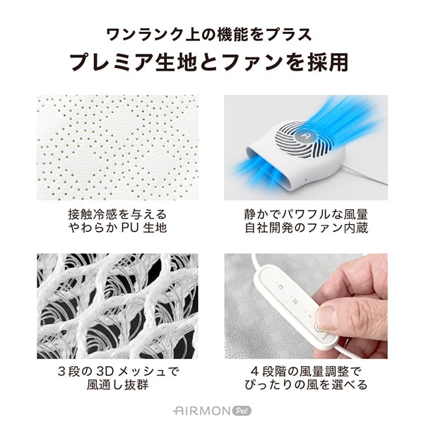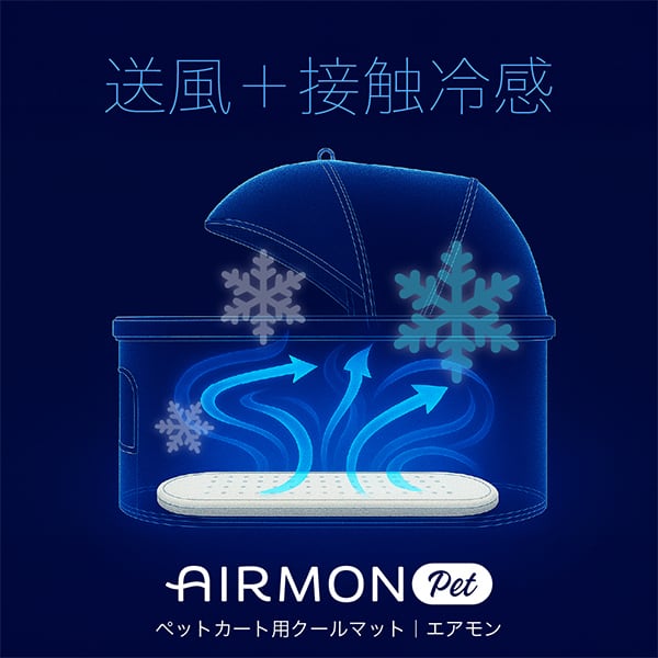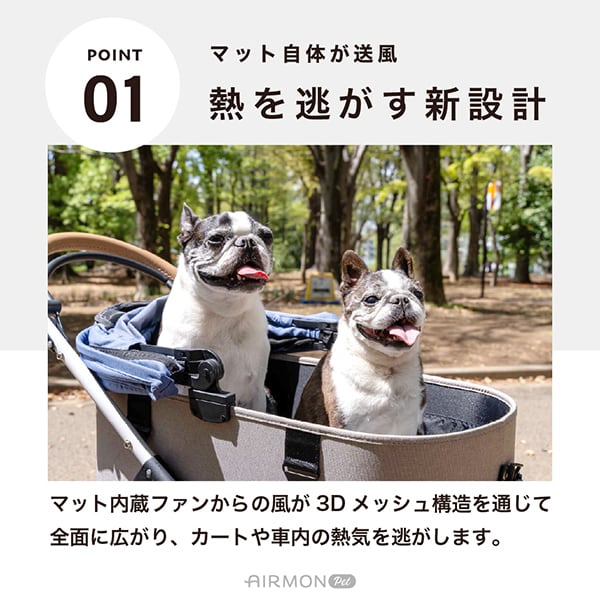 マットに内蔵されたファンからの風が3Dメッシュ構造を通じて全面に広がり、カートや車内の熱気を逃します。