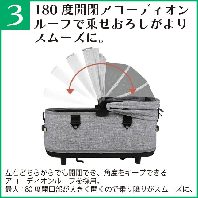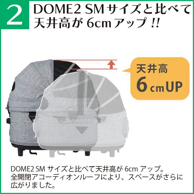 DOME2・SMサイズと比べて、よりキャビンが深くなり、ルーフの天井高も6cmアップ。左右どちらからでも開閉できる全開閉アコーディオンルーフにより、スペースがさらに広がりました。