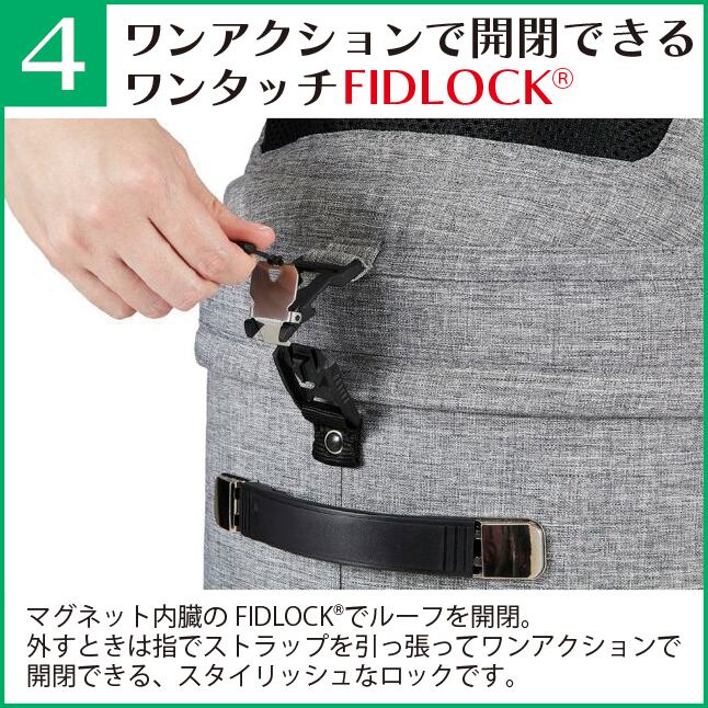外すときは指でストラップを引っ張り、ワンアクションで開閉できるスタイリッシュなマグネット内蔵ロックのFIDLOCKを採用しました。