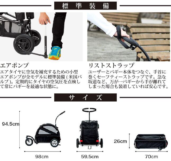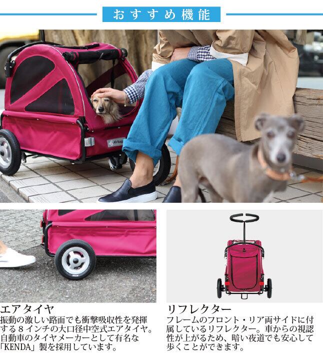 中型犬や小型犬の多頭飼いに人気の中型モデル。車輪を外せば、ハウスとしてご使用できます。愛犬が自ら乗り降りできる設計で抱きあげる必要がありません。折りたたむと厚さ26cmのコンパクトに。フロント・リア両サイドにリフレクターを搭載し、夜道も安心。