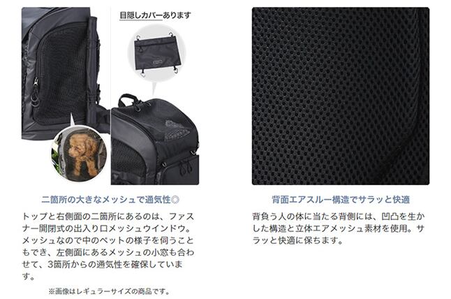 トップと右側面の二箇所にあるのは、ファスナー開閉式の出入り口メッシュウインドウ。メッシュなので中のペットの様子を伺うこともでき、左側面にあるメッシュの小窓も合わせて、3箇所からの通気性を確保しています。