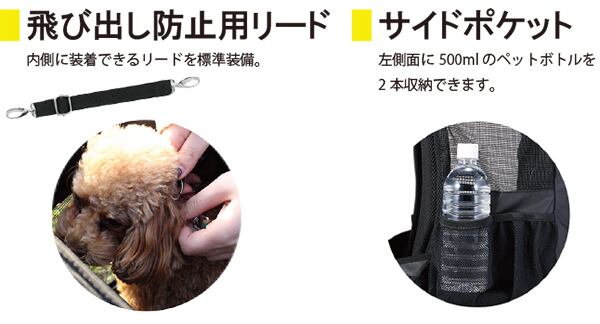 飛び出し防止リード付き。サイドポケットにはペットボトルを2本収納できます。