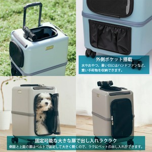 側面と上面の扉はベルトで固定して大きく開くので、ラクにペットの出し入れができます。