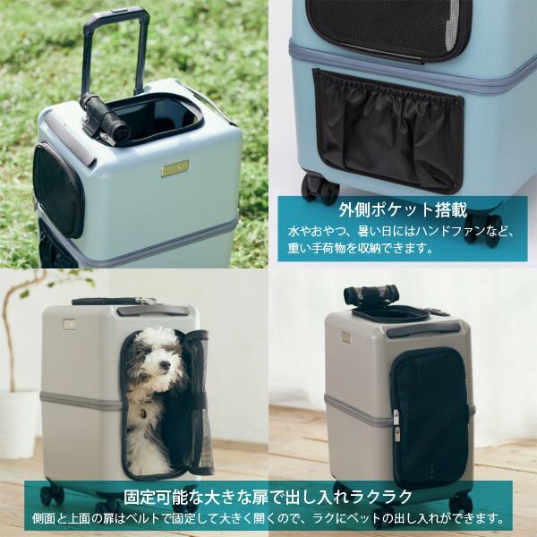 側面と上面の扉はベルトで固定して大きく開くので、ラクにペットの出し入れができます。