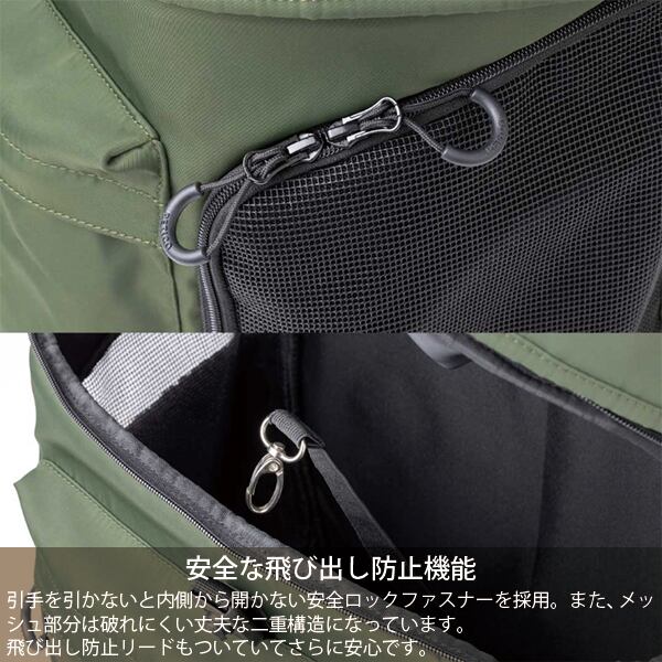 引手を引かないと内側から開かない安全ロックファスナーを採用。メッシュ部分は破れにくい丈夫な二重構造になっています。
